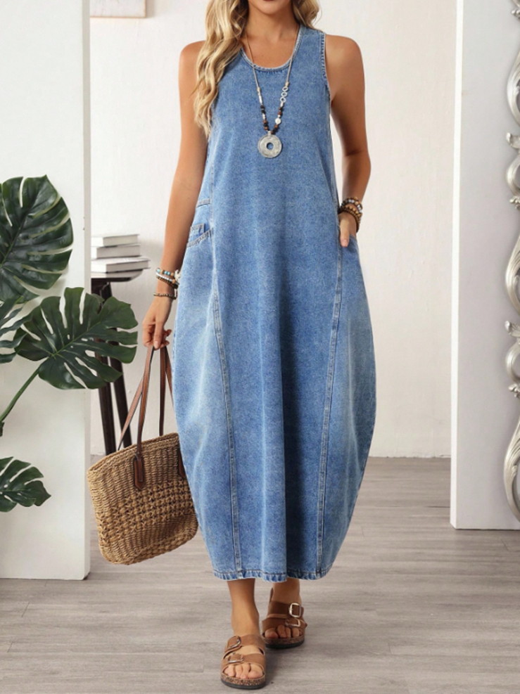 This is a sleeveless denim dress with a classic, casual touch that will never go out of style. Denim is a fabric that has never left the clothing industry, and this one takes its traditional quality and makes it a plus-size-friendly garment. It features a relaxed but structured fit, making it rather comfortable, durable, and ideal for everyday use. Its sleeveless design makes it better suited to warmer weather, and the denim material gives it a somewhat structured texture that makes the overall appearance more appealing. It is both casual and formal and can be used on a number of occasions. This dress can be worn anywhere you travel, whether you are out for a simple lunch or out on a day. Another important highlight is its versatility. One can wear it in a variety of ways: with sneakers for a casual look, sandals in summer, and a jacket in colder weather. The longevity nature of denim makes this item a permanent part of your wardrobe.