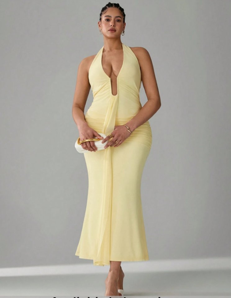 It is a bold, luxurious special-occasion dress designed as a halter dress with no back and a fishtail. Its smooth lines and dramatic figure emphasize curves in a highly classy and assertive manner. The halter neckline not only makes the shoulders and neckline noticeable, but also the backless feature adds a touch of modernity. The fishtail cut is used to make the shape more complete, giving it a flowing appearance that makes the figure appear longer and creates movement. The design is also very flattering for plus-size bodies because it makes curves prominent, but in a structured and elegant way. Its solid color makes it elegant and versatile, so it can be easily styled with accessories.