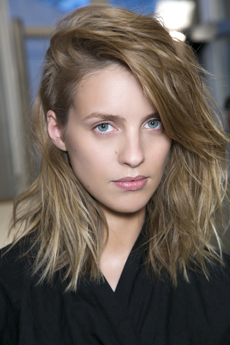 Designer, Mischka Badgely constructs the art of combining two looks in one; loose waves and a side parting. This helps to frame the facial features; although there is little volume; the weightier side of the parting makes the hair look thicker.