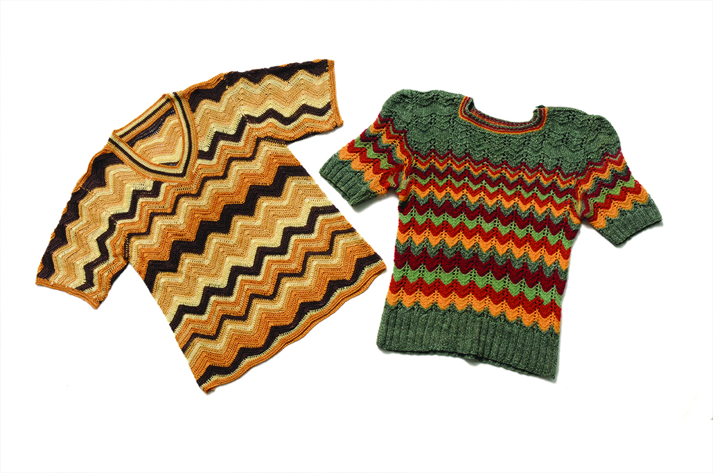 1930s hand-knit daywear. Gold, marigold primrose and brown chevron crochet knit (left) and Shetland wool ‘feather and fan’ stitch short-sleeved knit. © Fashion and Textile Museum / C20 Vintage