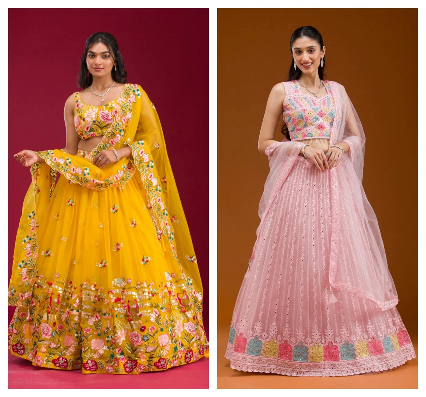 – Georgette: Draping, flattering, and so comfortable. Ideal for flared lehengas and lehenga cholis with detailed work.